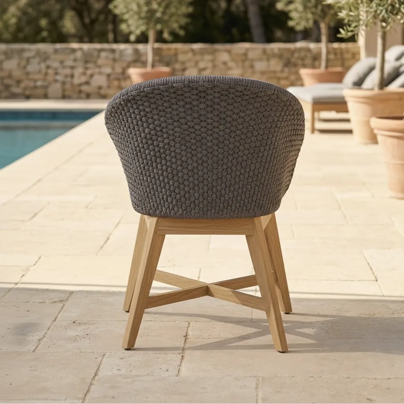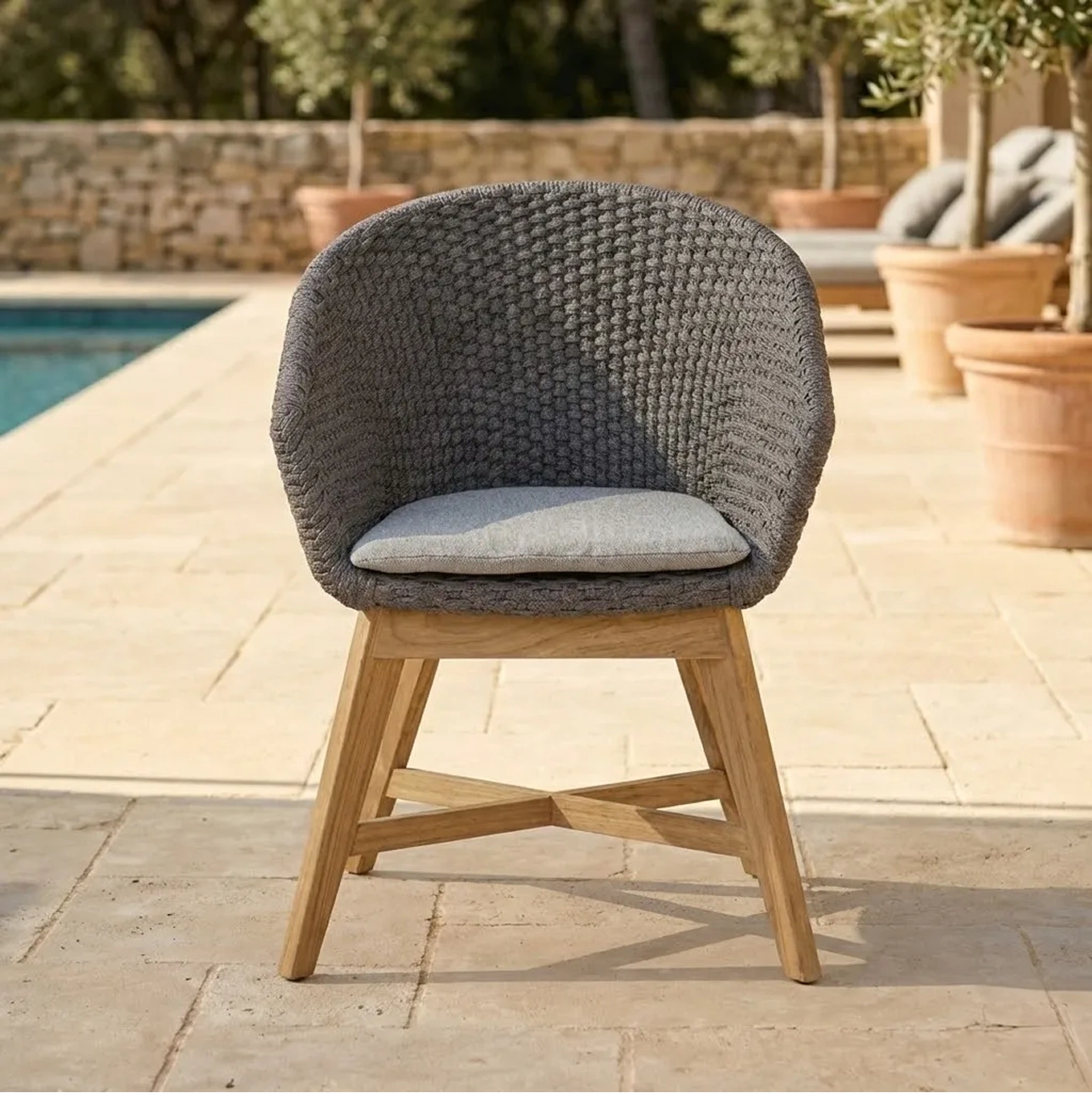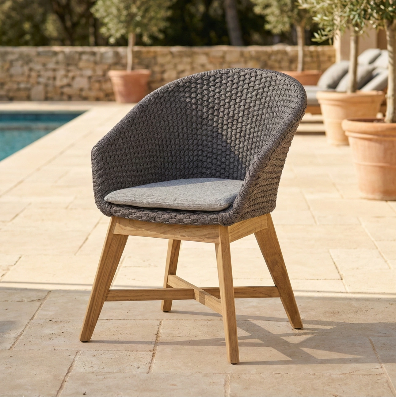 Harlene Chair offers a refined take on relaxed outdoor seating. Featuring a tightly woven rope shell, supportive seat cushion, and solid teak base, its rounded silhouette delivers ergonomic comfort while maintaining durability, balance, and a warm, contemporary aesthetic.
