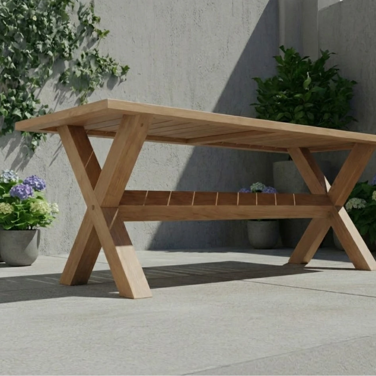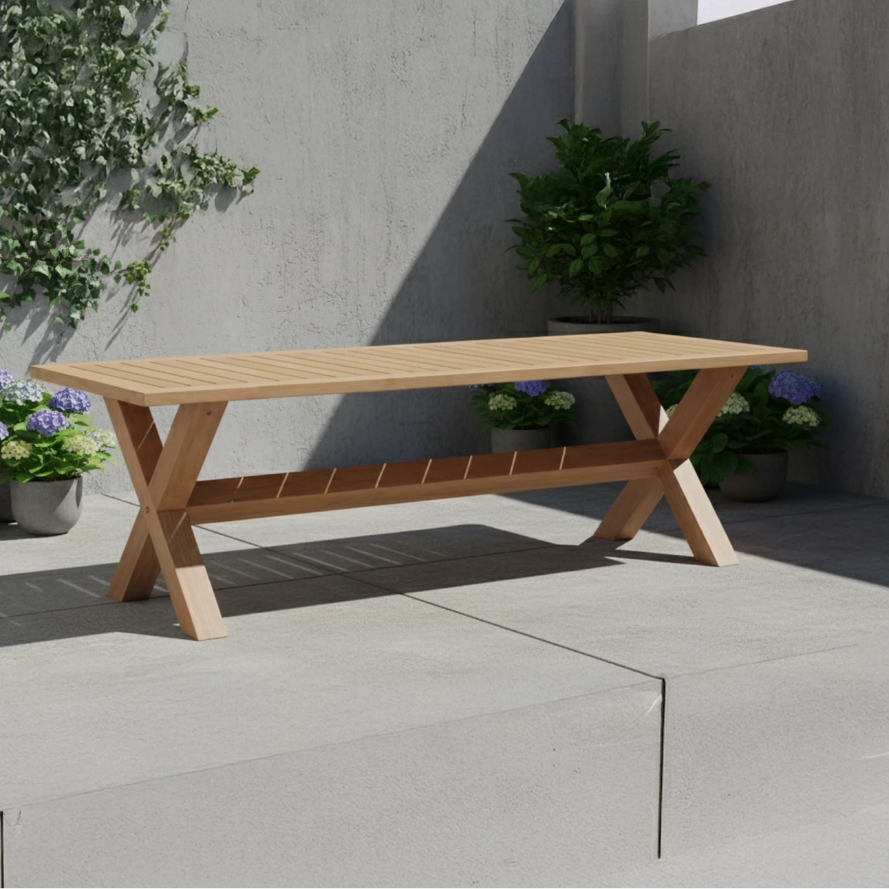 Ocean Rectangular Table features a clean linear silhouette that highlights material honesty and structural clarity. Crafted from solid teak, its slatted surface and cross leg construction deliver durability, stability, and a balanced presence suited to refined outdoor dining and everyday use.
