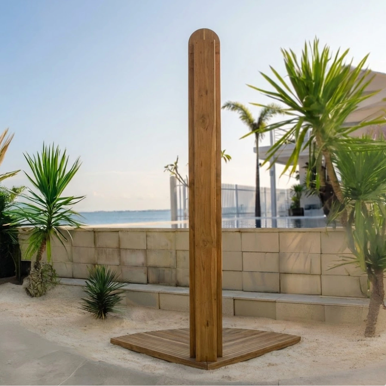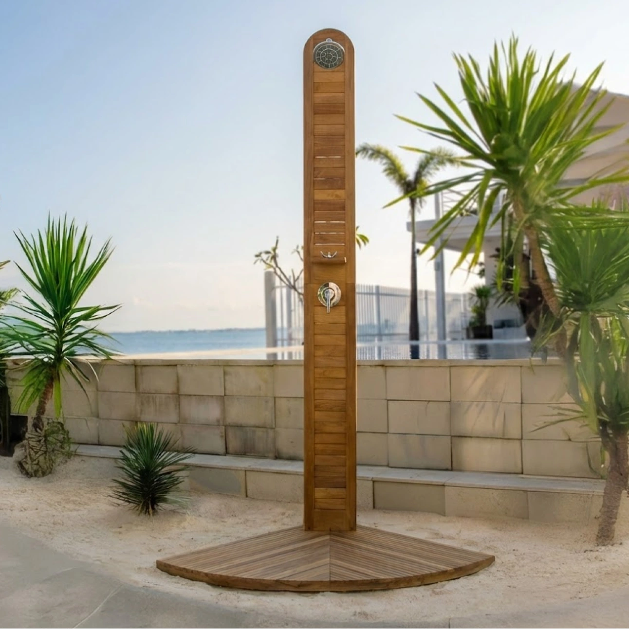 Teak Shower features a clean, vertical form crafted from solid teak, designed for outdoor use in poolside, garden, or coastal settings. Its slatted surface promotes quick drainage while the integrated shower fittings deliver durability, stability, and a refined natural presence in open-air environments.