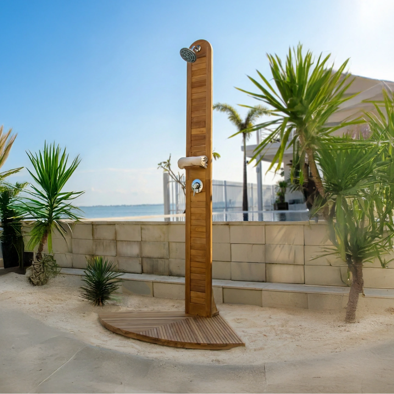 Designed for outdoor showers and resort-style spaces, Teak Shower offers a refreshing, functional experience while blending seamlessly into natural surroundings with timeless teak character.